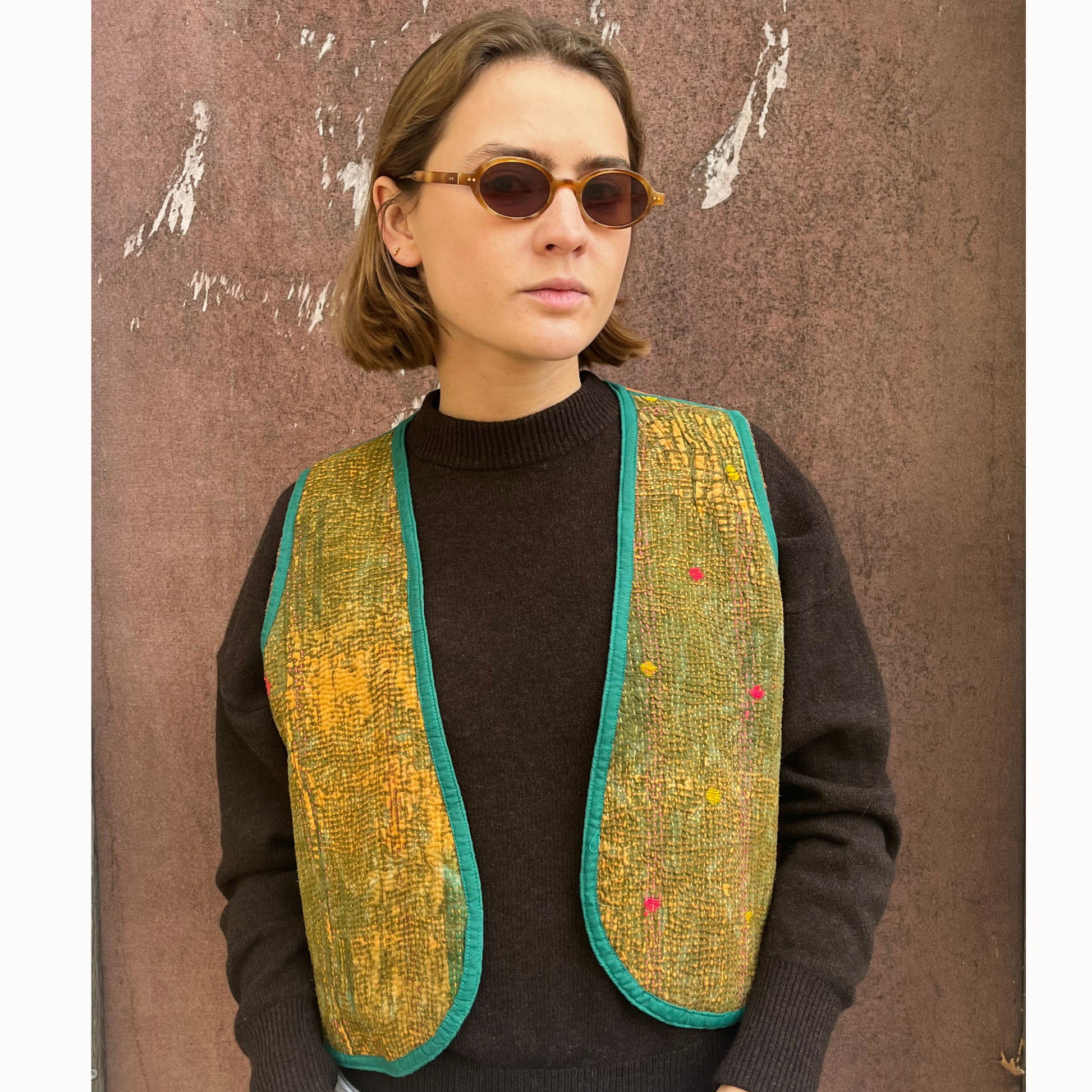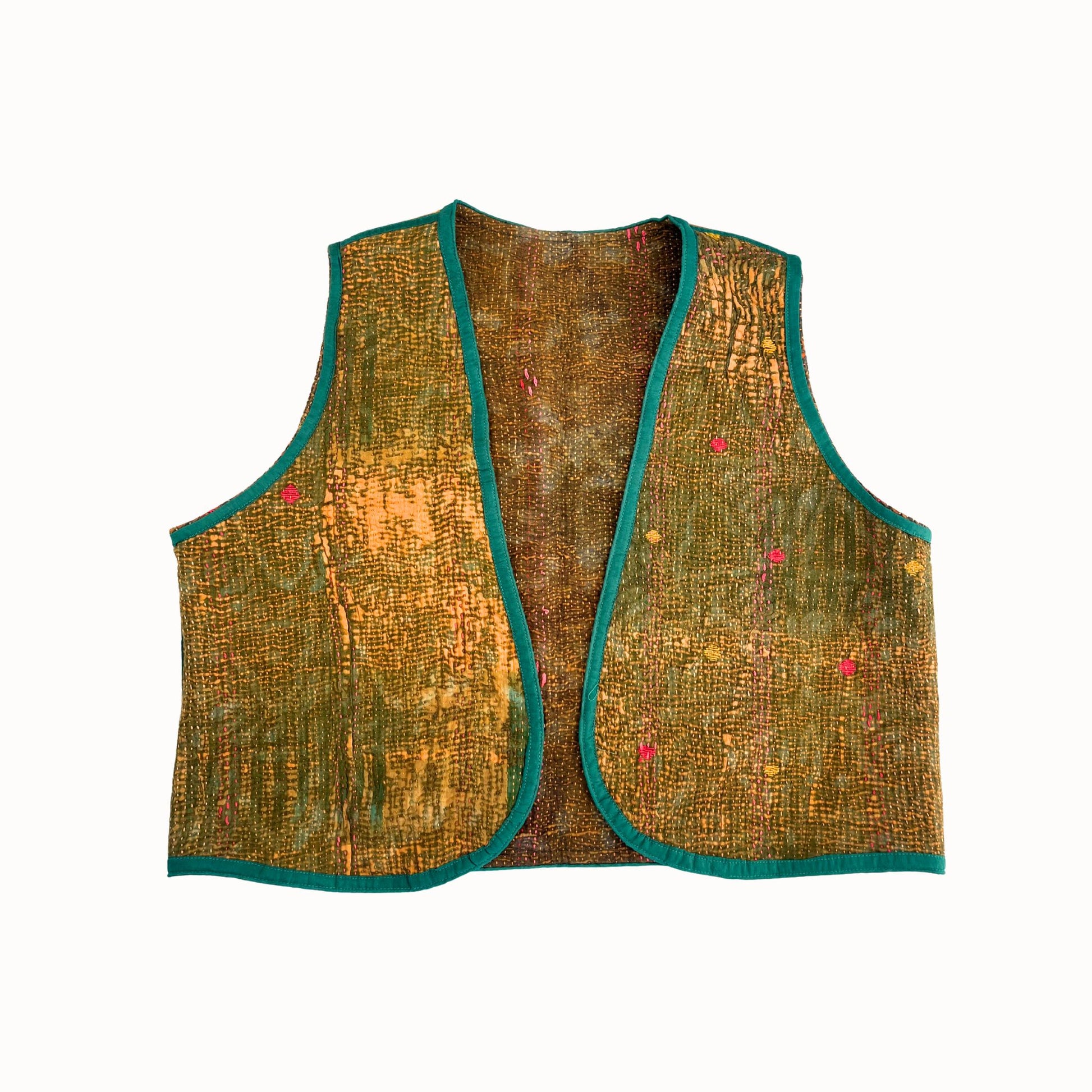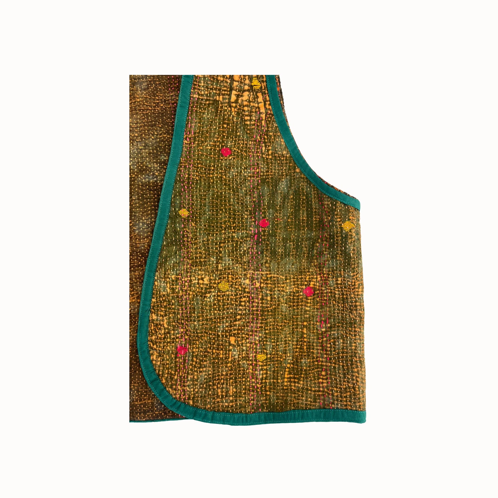 Gilet unique orange confectionné à partir de tissus traditionnels indiens en Kantha. Réversible, léger et confortable, il se porte aussi bien sur une chemise, un t-shirt ou un pull ...