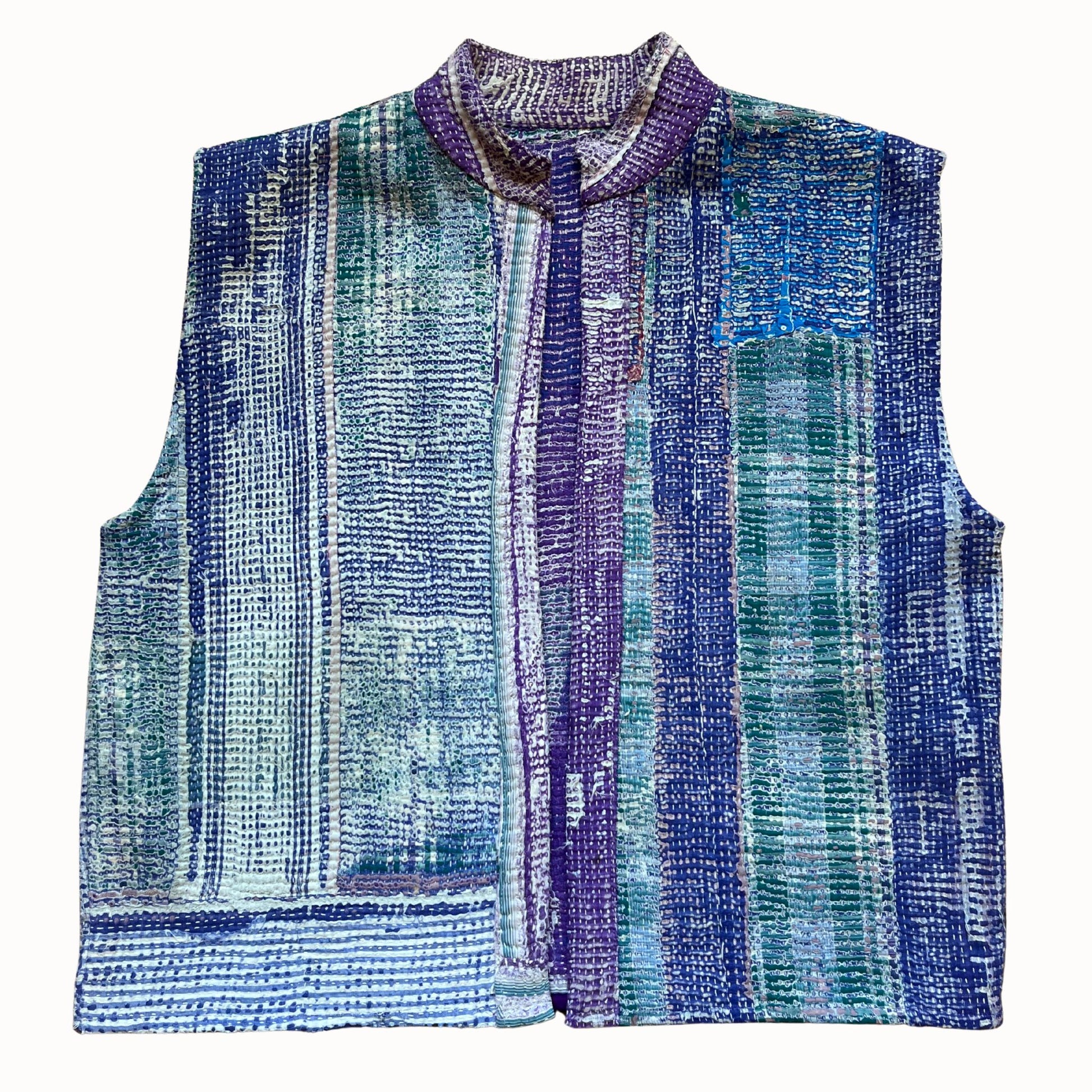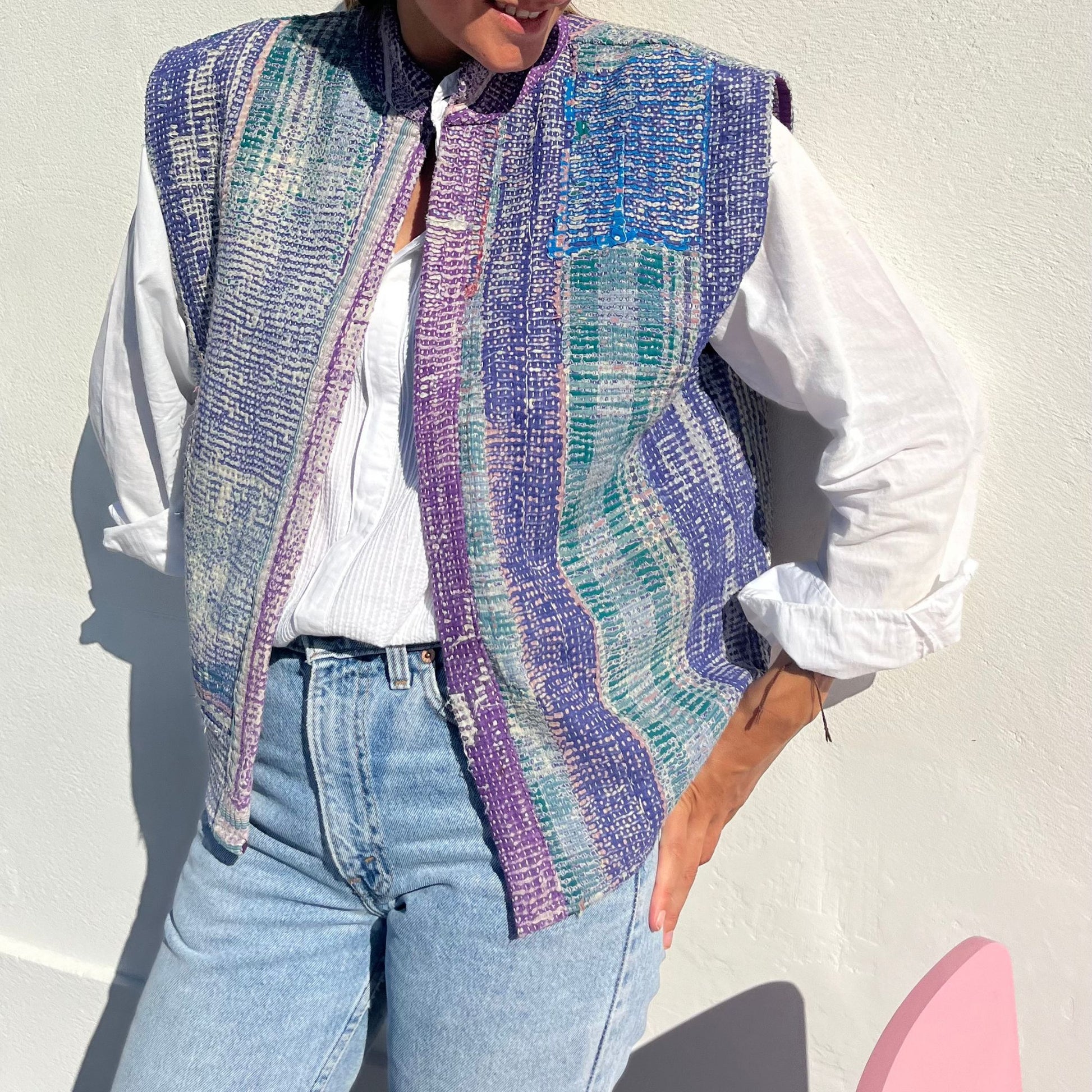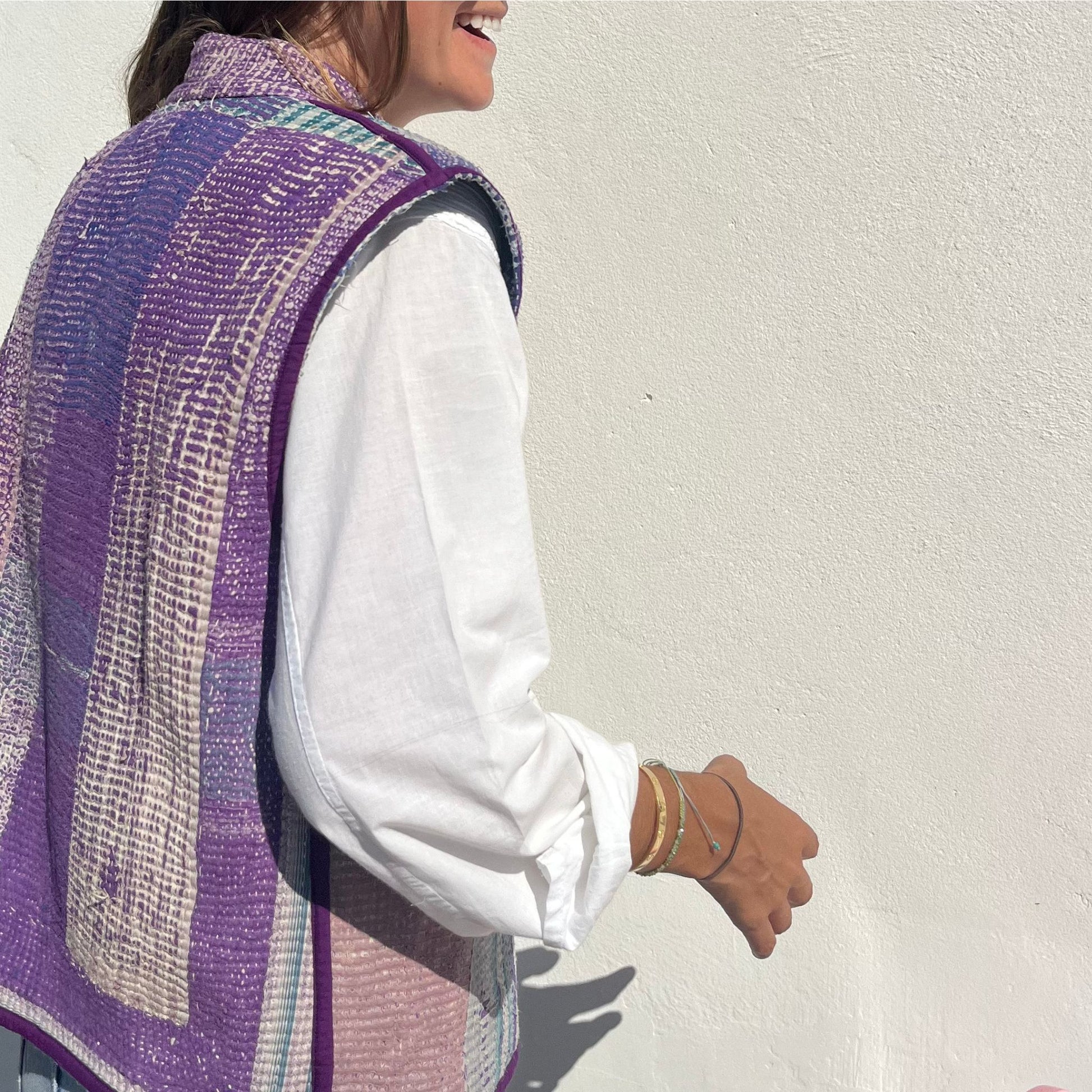 Gilet unique confectionné à partir d’anciens saris de coton. Réversible, léger et confortable il se porte aussi bien sur une chemise ou un pull.