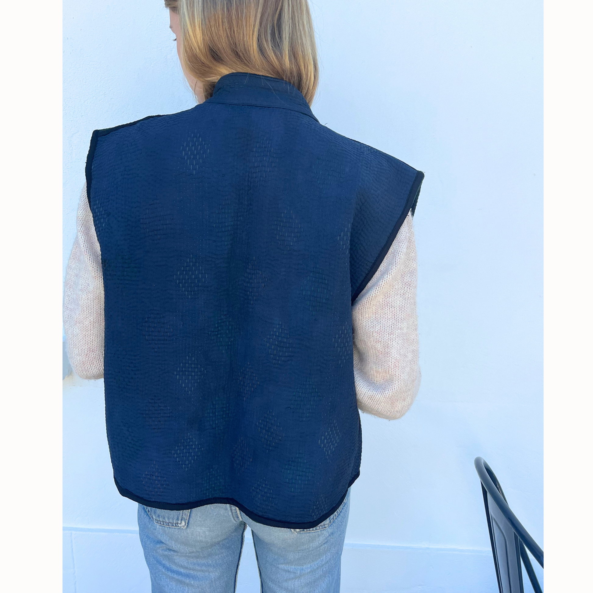 Gilet unique confectionné à partir d’anciens saris de coton. Réversible, léger et confortable il se porte aussi bien sur une chemise ou un pull. Ce gilet a été teint, il est recommandé de le laver séparément lors du premier lavage.