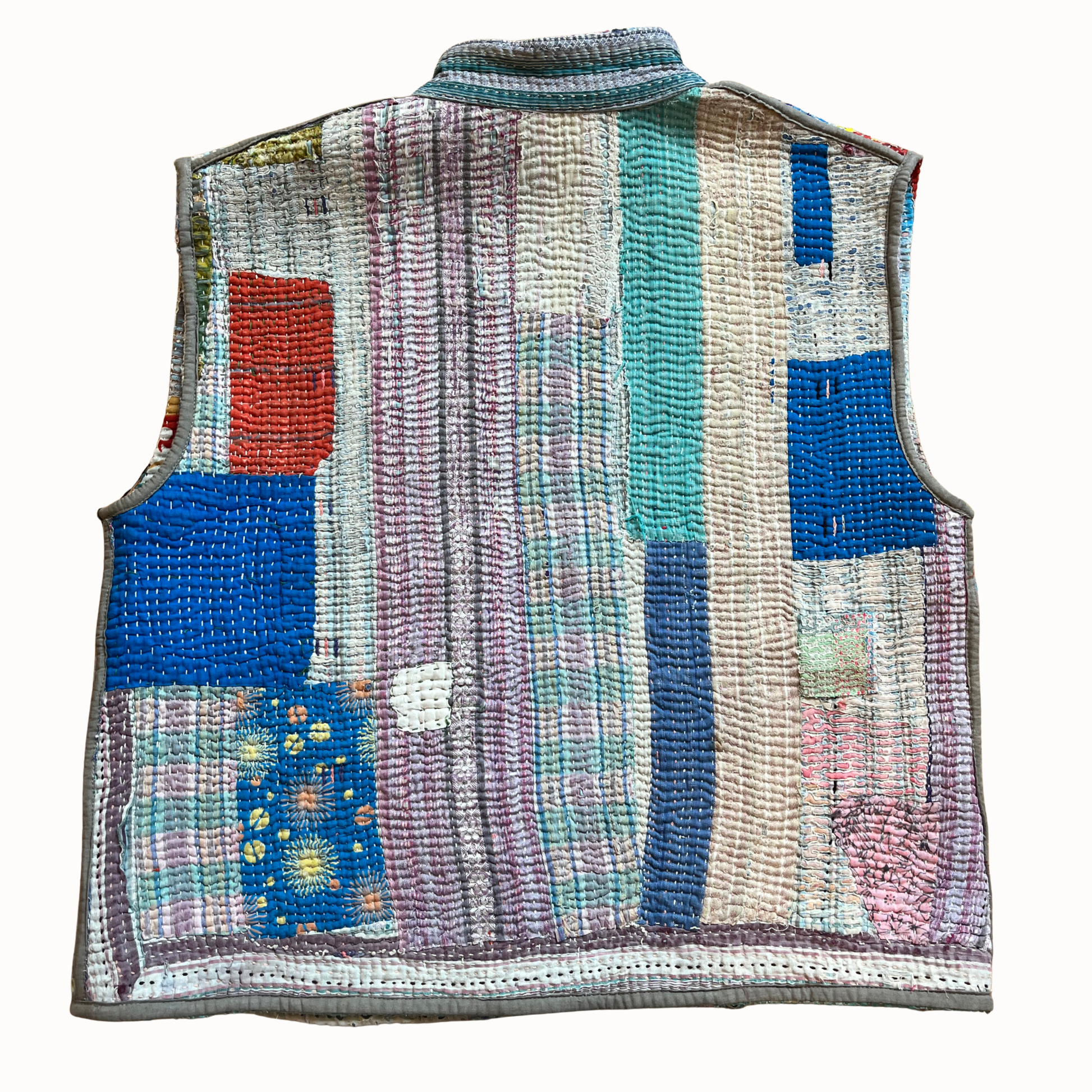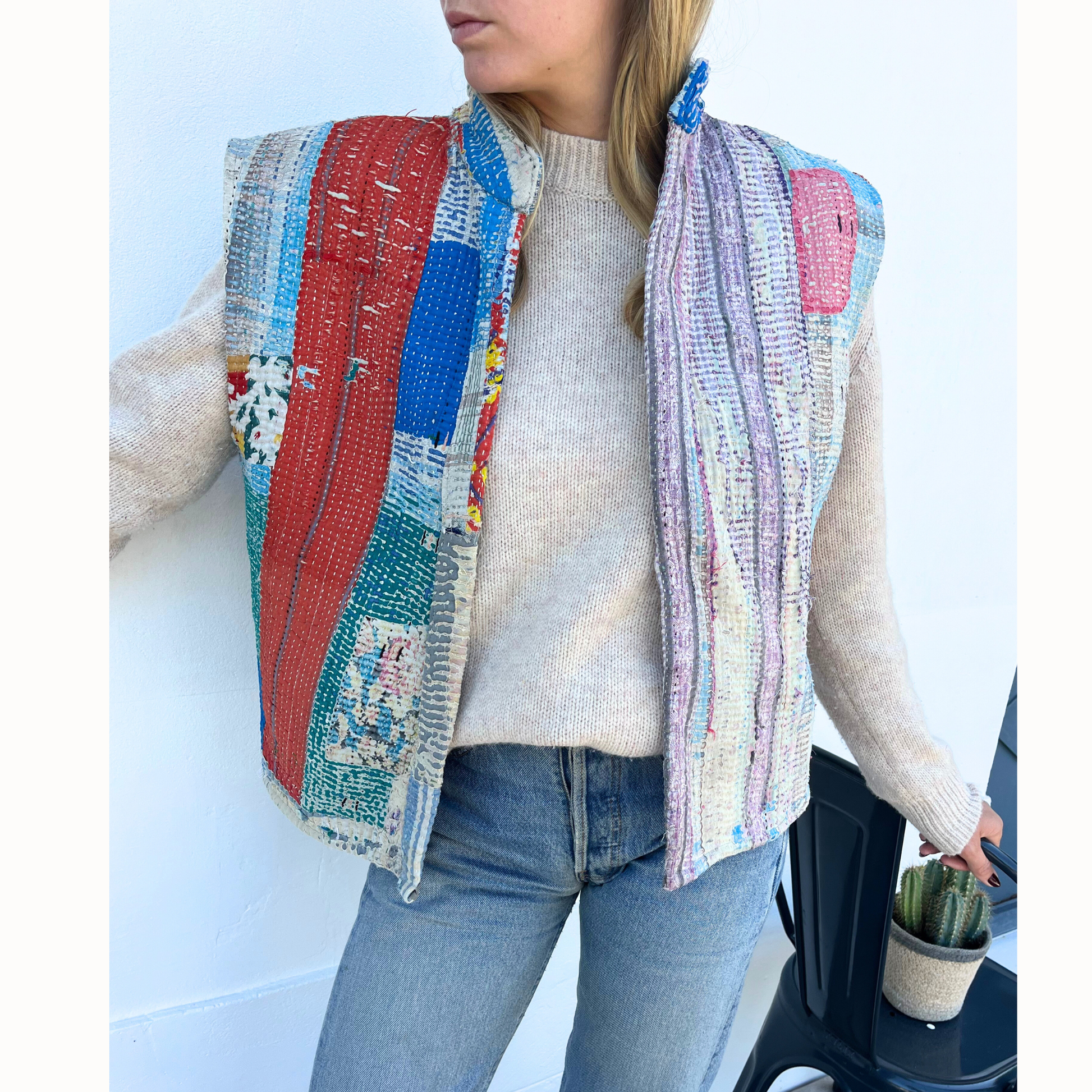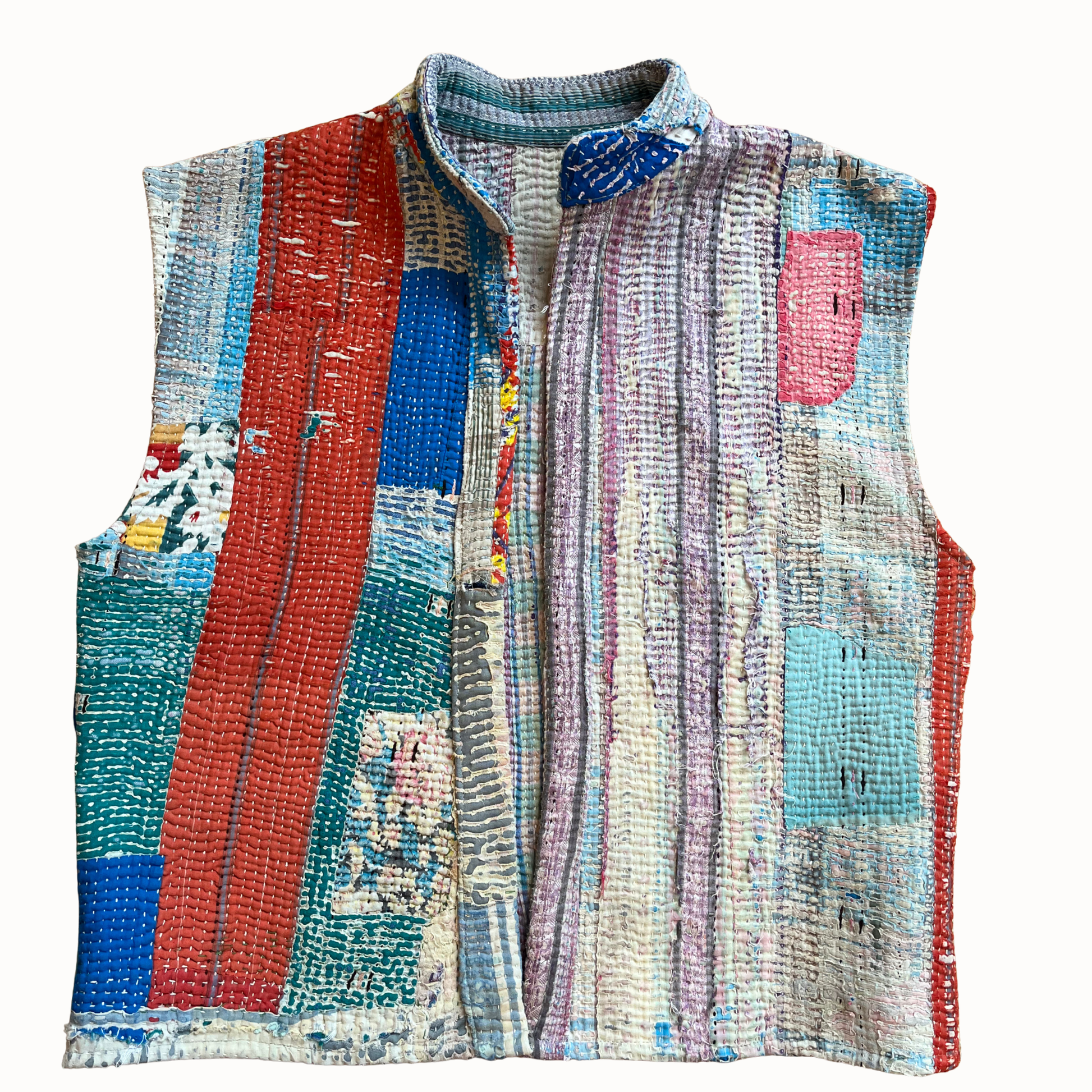 Gilet unique confectionné à partir d’anciens saris de coton. Réversible, léger et confortable il se porte aussi bien sur une chemise ou un pull.