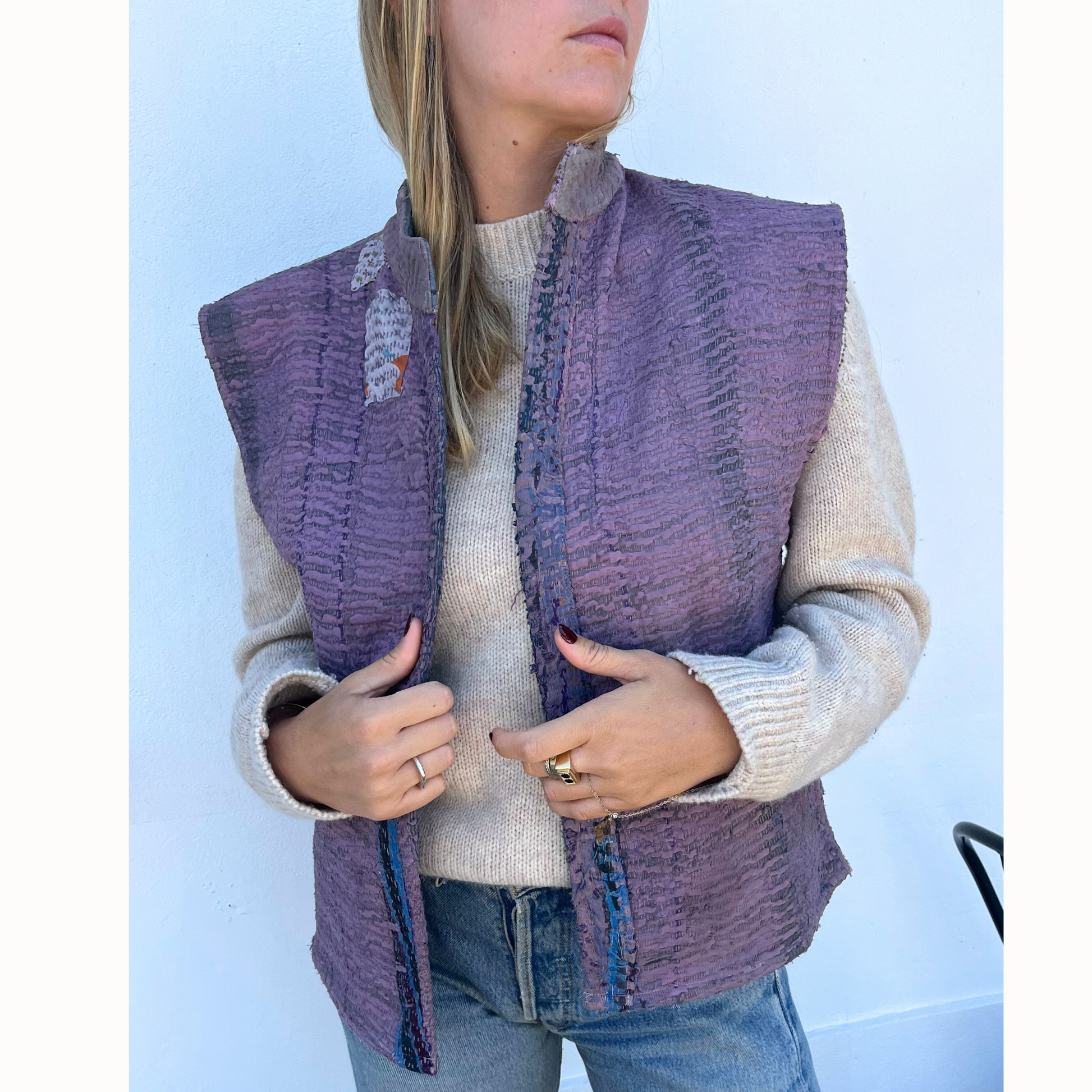 Gilet unique confectionné à partir d’anciens saris de coton. Réversible, léger et confortable il se porte aussi bien sur une chemise ou un pull. Ce gilet a été teint, il est recommandé de le laver séparément lors du premier lavage.