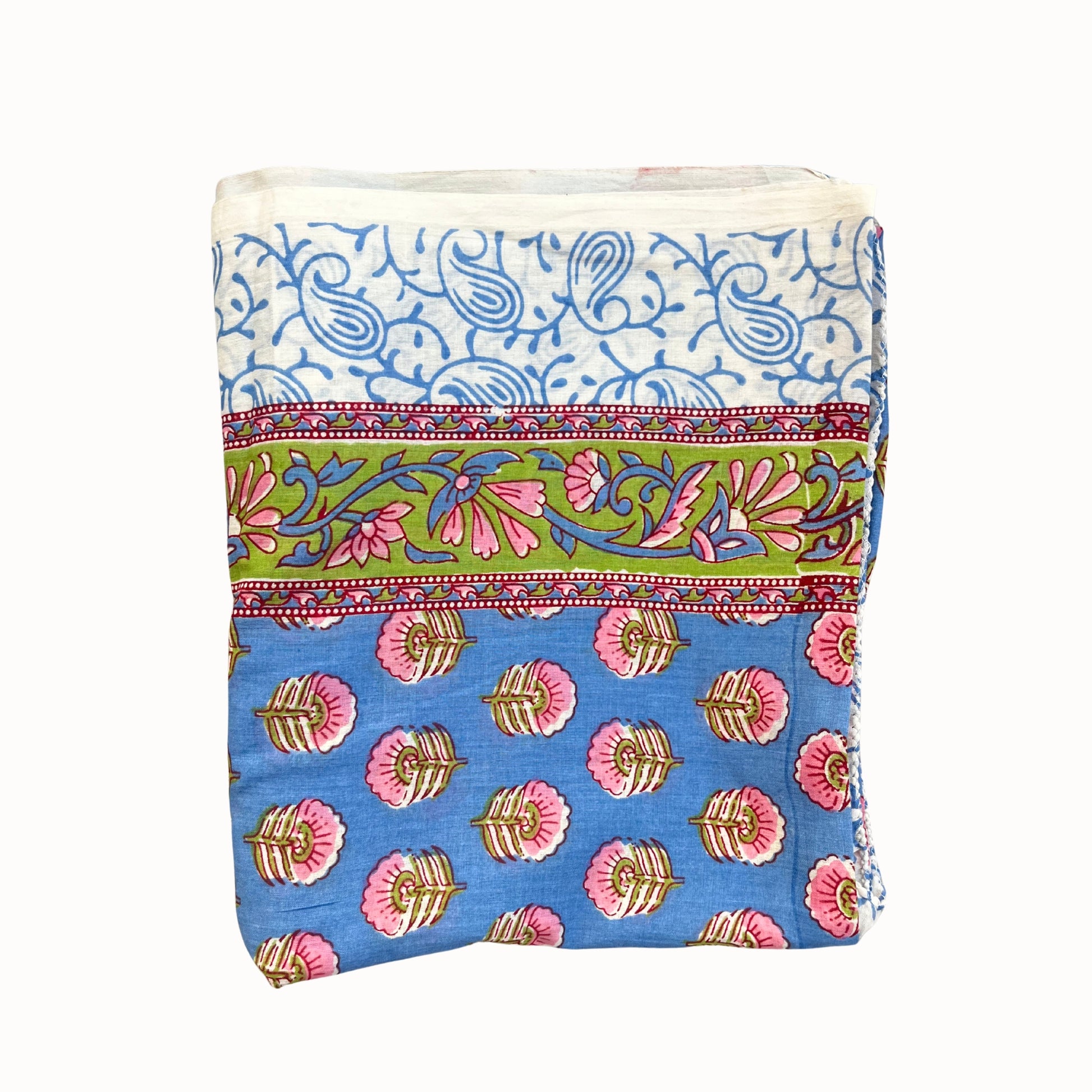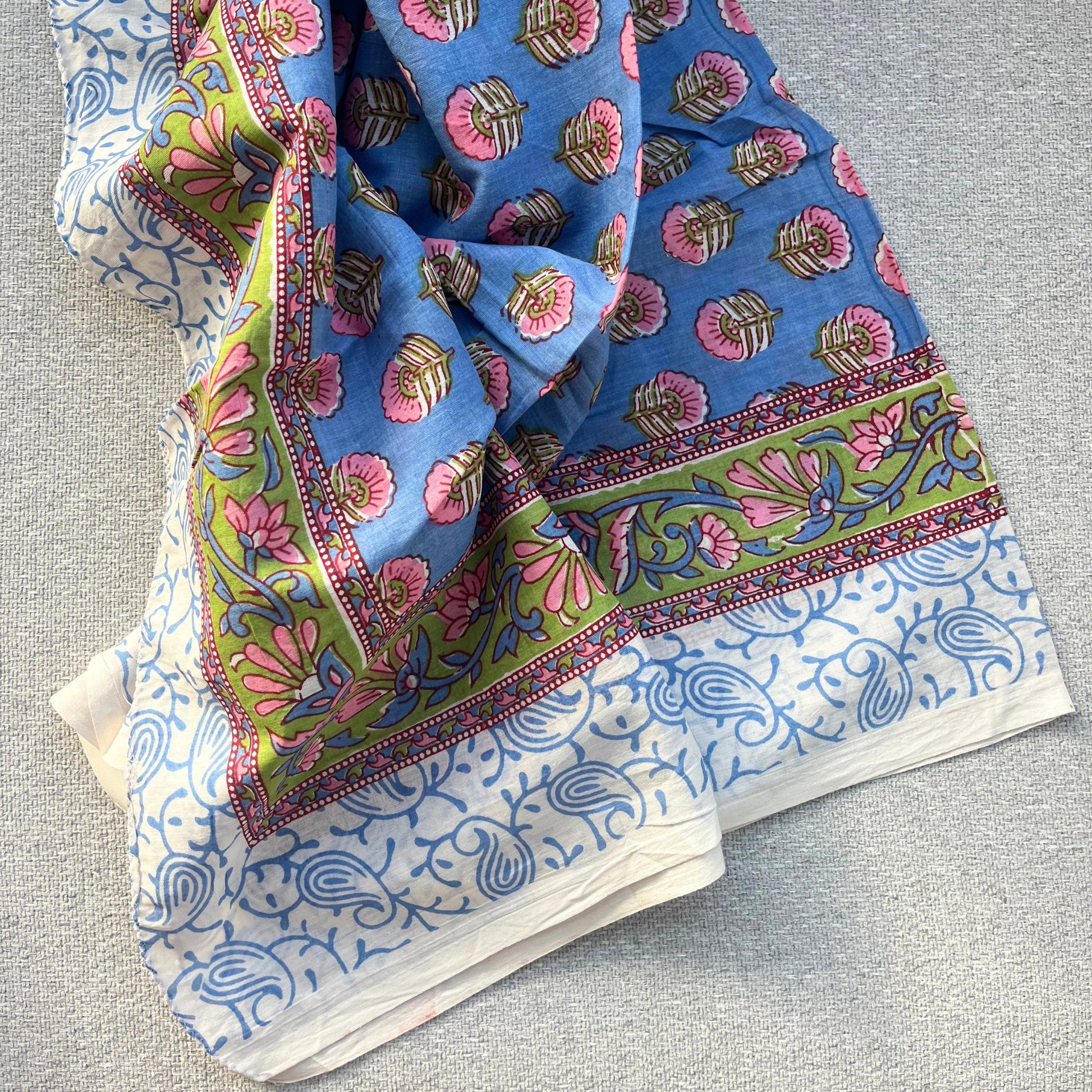 Paréo bleu en voile de coton, imprimé à la main au tampon de bois. Une pièce artisanale, douce et légère, parfaite pour l’été. À mettre en nappe l'hiver, si l'été te manque ...
