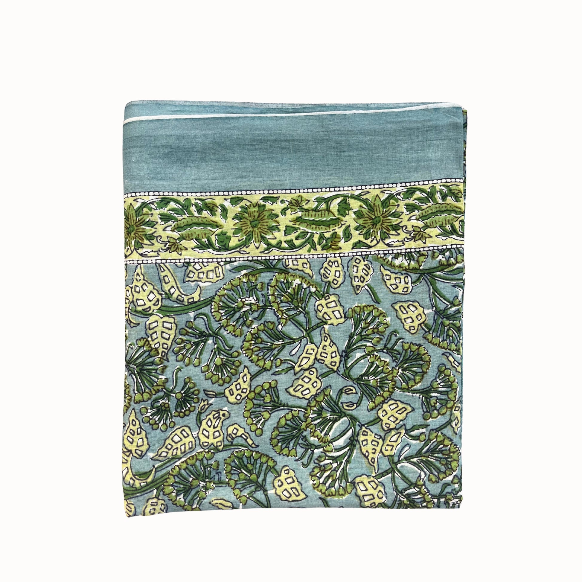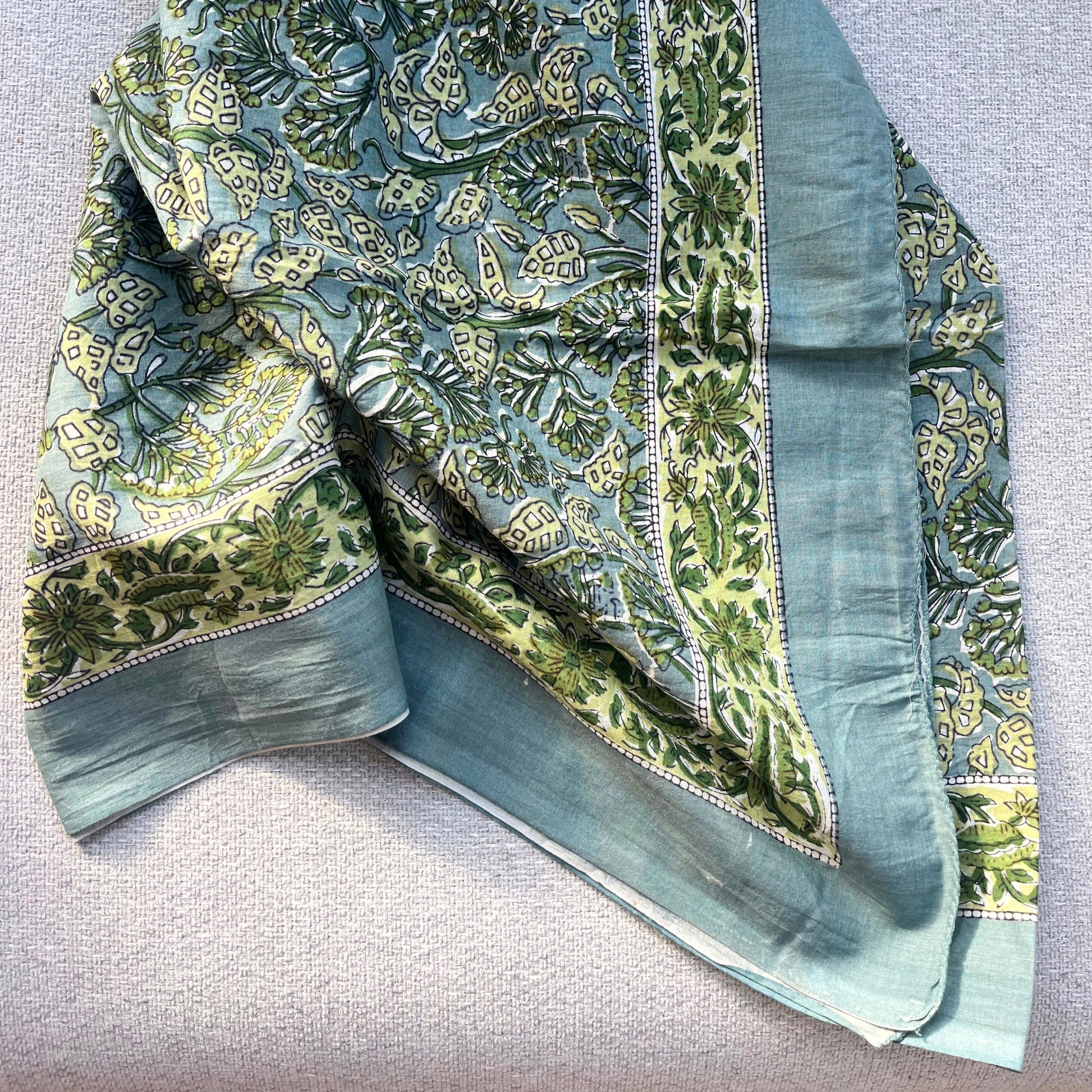 Paréo vert en voile de coton, imprimé à la main au tampon de bois. Une pièce artisanale, douce et légère, parfaite pour l’été. À mettre en nappe l'hiver, si l'été te manque ...