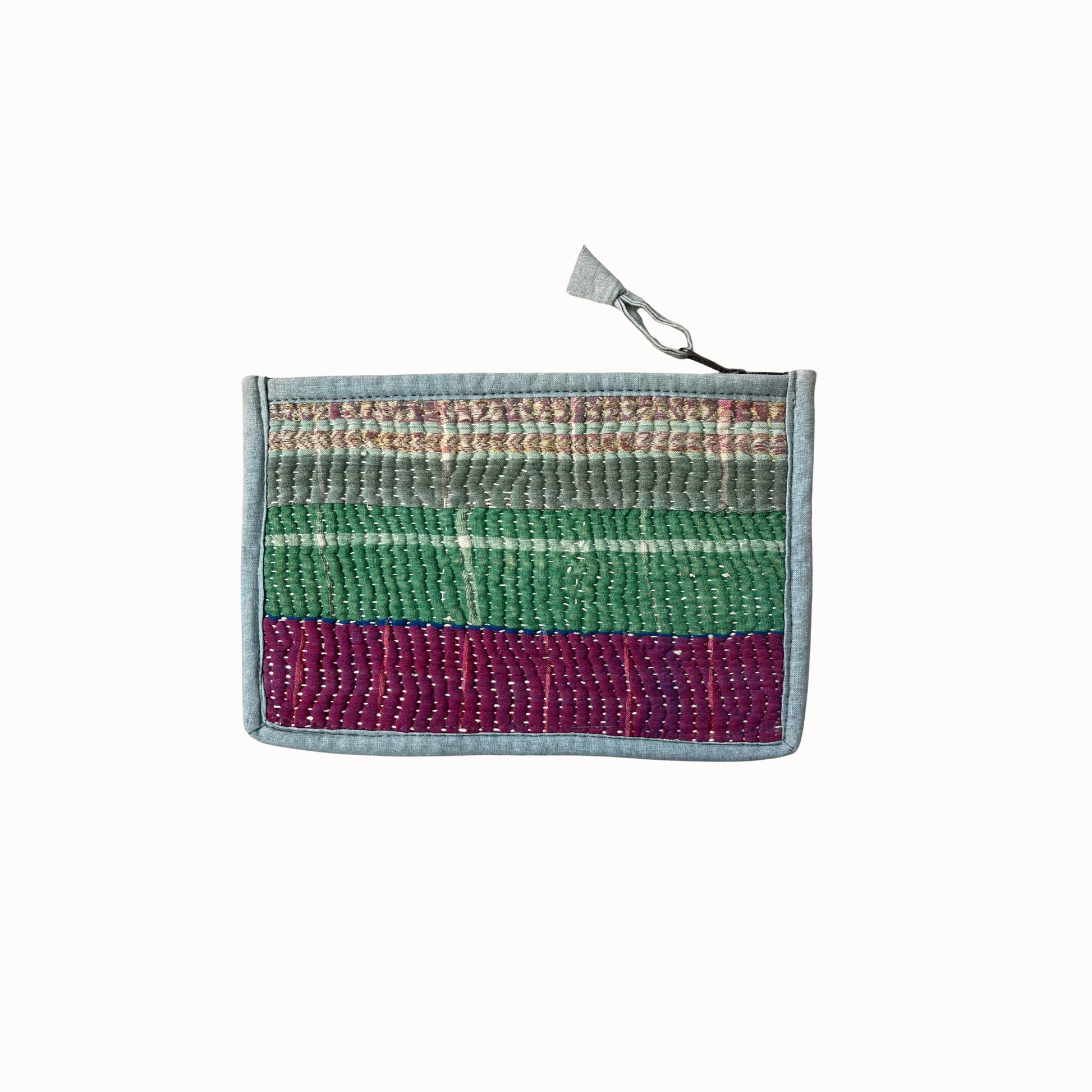 Pochette unique rose et verte, réalisée à partir de chutes de kantha, tissu vintage indien.